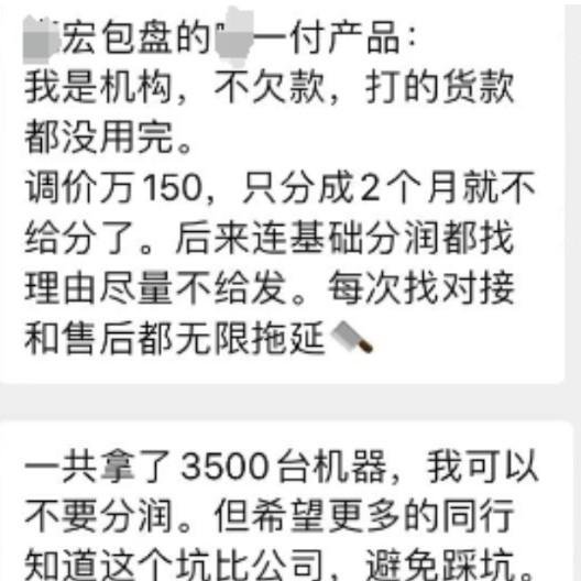 該代理商自稱做的是H宏的H一付產(chǎn)品,曾拿貨3500臺。然而,在毫無征兆的情況下,分潤被停,調(diào)價答應(yīng)的分成也只短暫發(fā)放了兩個月。面對售后人員的敷衍態(tài)度,代理商感到無比憤怒和無奈。他們猜測,操盤方可能是想要通過停發(fā)分潤的方式,逼迫他們繼續(xù)拿貨跟做產(chǎn)品。但代理商明確表示,他們沒有繼續(xù)合作的意愿,只希望能曝光這個坑人的公司,避免更多同行踩坑。