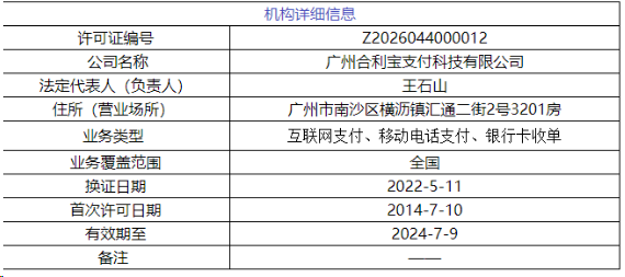 合利寶成立于2013年7月19日,總部位于廣州。合利金融旗下子公司,于2017年被仁東控股收購(gòu),并于2019年獲支付牌照續(xù)展。合利寶經(jīng)營(yíng)范圍包括互聯(lián)網(wǎng)支付、移動(dòng)電話支付、銀行卡收單,展業(yè)范圍為全國(guó)。