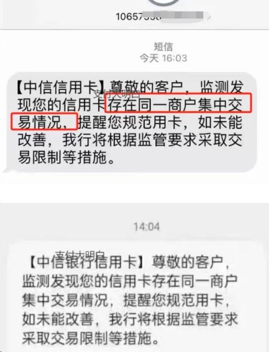 中信銀行提醒:尊敬的客戶,監(jiān)測發(fā)現(xiàn)您的信用卡存在同一商戶集中交易情況,提醒您規(guī)范用卡,如未能改善,我行將根據(jù)監(jiān)管要求采取交易限制等措施。