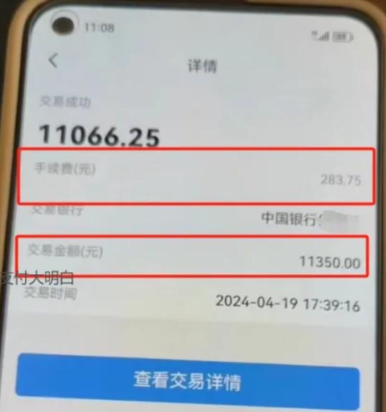 另有客戶,刷卡11350,扣手續(xù)費(fèi)283.75,平均手續(xù)費(fèi)是萬250,這差不多是正常手續(xù)費(fèi)的4倍以上了。