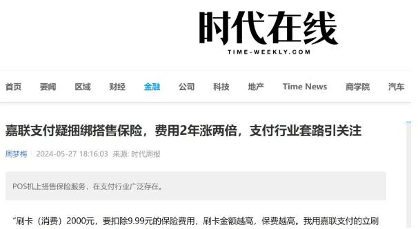 2024年5月27日,時代周報發(fā)布文章《嘉聯(lián)支付疑捆綁搭售保險,費用2年漲兩倍,支付行業(yè)套路引關(guān)注》。