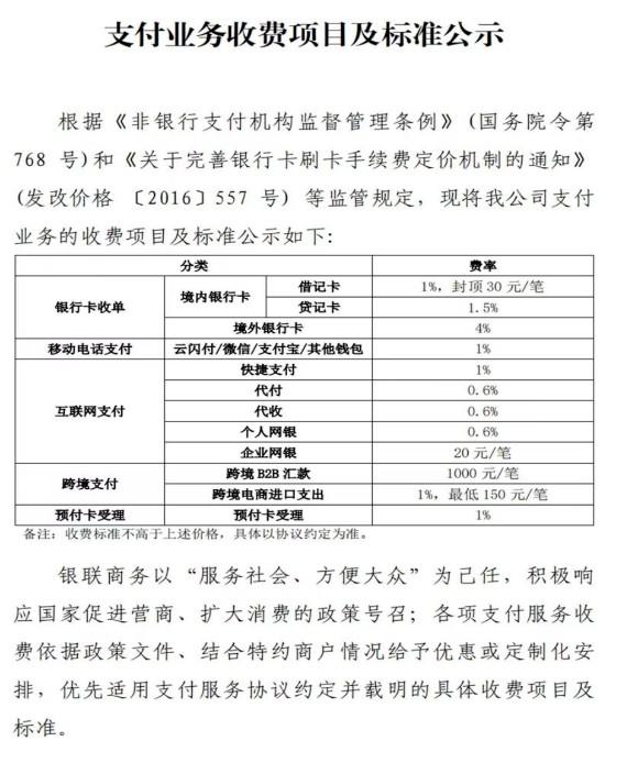 銀聯(lián)商務(wù)公布了新的收單業(yè)務(wù)收費標準,明確公示了貸記卡費率1.5%,借記卡1%,30元封頂。