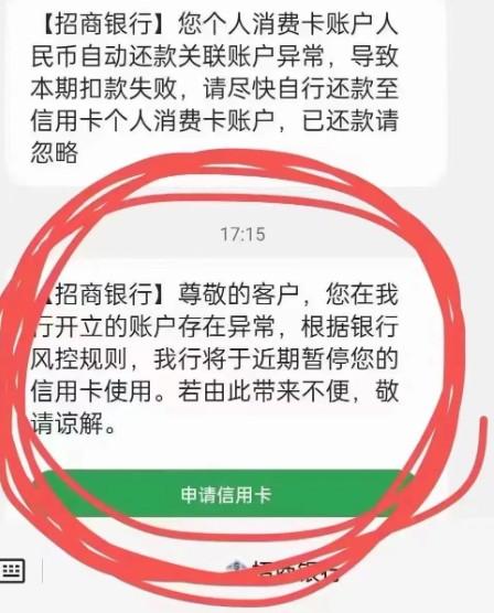 招商銀行發(fā)短信通知信用卡暫停使用。