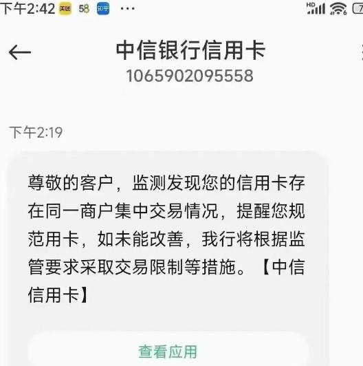 中信信用卡發(fā)短信提醒存在同一商戶集中交易情況