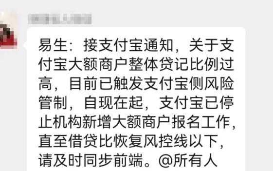 關(guān)于支付寶大額商戶整體貸記比例過(guò)高,目前已觸發(fā)支付寶側(cè)風(fēng)險(xiǎn)管制,自現(xiàn)在起,支付寶已停止機(jī)構(gòu)新增大額商戶報(bào)名工作,直至借貸比恢復(fù)風(fēng)控線以下,請(qǐng)及時(shí)同步前端。
