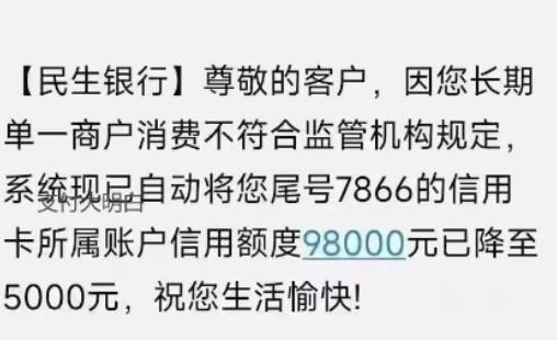 還有用戶收到短信:因您長(zhǎng)期單一商戶消費(fèi)不符合監(jiān)管機(jī)構(gòu)規(guī)定,系統(tǒng)現(xiàn)已自動(dòng)將您的信用額度98000元降至5000元。降額比例接近95%,也屬于廢卡了。