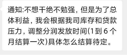 有代理商收到上級(jí)通知:不想干絕不勉強(qiáng),但是為了總體利益,我會(huì)根據(jù)我司庫存和貸款壓力,調(diào)整分潤發(fā)放時(shí)間(1-6個(gè)月結(jié)算一次)具體怎么結(jié)算待定。