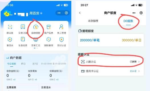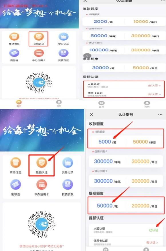 (1)支付寶掃一掃,掃描機(jī)器背后二維碼,輸入身份證后6位,選擇提額認(rèn)證—人臉認(rèn)證即可,(做完人臉認(rèn)證,單筆秒到5萬(wàn),一天秒到20萬(wàn),如果不夠,可以再認(rèn)證一張本人信用卡,每天秒到額度上漲到30萬(wàn)),營(yíng)業(yè)執(zhí)照用戶(hù)可不用。