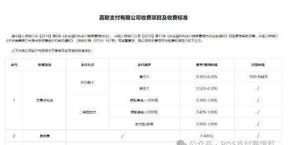 嘉聯(lián)支付在今年2月份公布了“收費(fèi)項(xiàng)目及收費(fèi)標(biāo)準(zhǔn)”,貸記卡POS刷卡交易手續(xù)費(fèi)為0.52%-2.50%,此外還公布了服務(wù)費(fèi)為0-400元,通訊費(fèi)為0-198元/年。