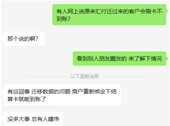 不過,近日有代理商曝出原匯付天下POS機(jī)的使用客戶,在轉(zhuǎn)移到新平臺后,可能會出現(xiàn)刷卡不到賬的情況。