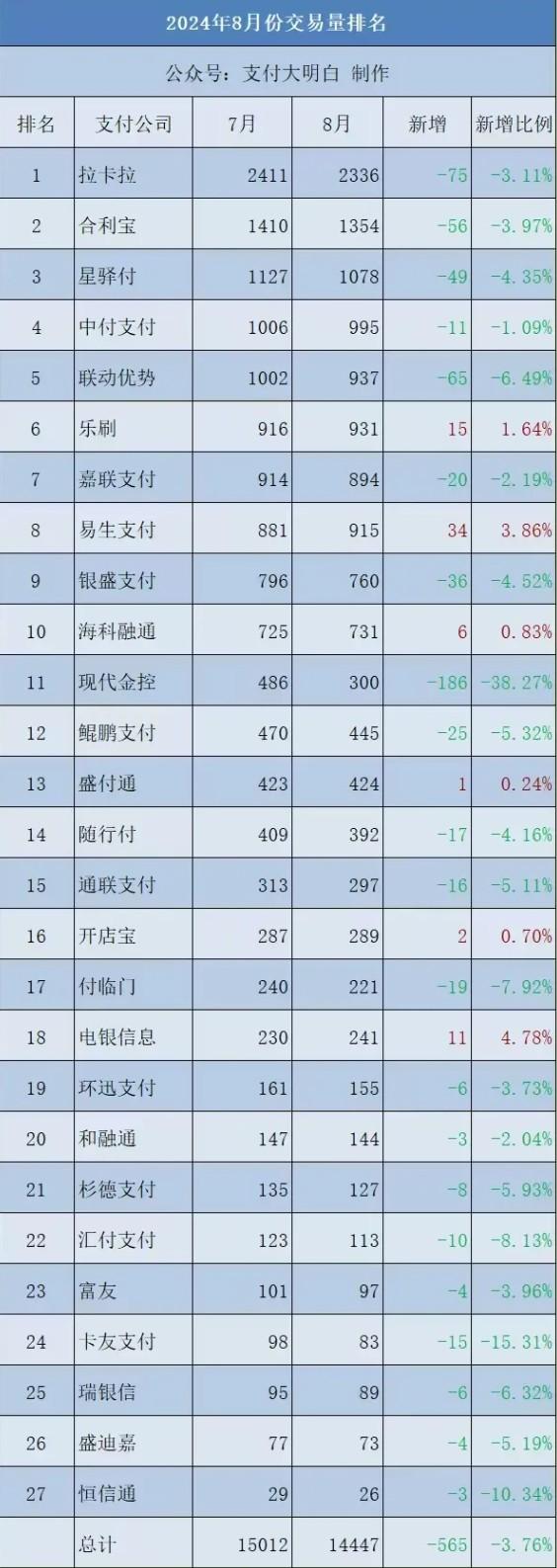 最新10月份支付公司交易量排名,穩(wěn)中有升