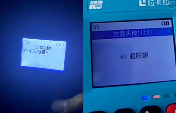 最近有很多拉卡拉用戶反映說自己的pos設備使用的時候提示提示61-超限額,如下圖具體是怎么回事呢?