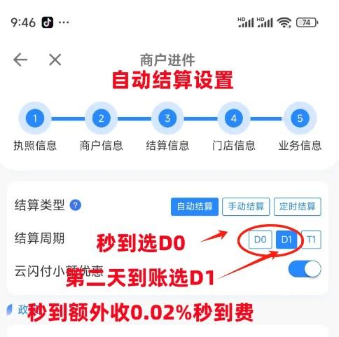 交易資金自動(dòng)結(jié)算到商戶入網(wǎng)結(jié)算銀行卡。具體有兩種結(jié)算方式,一種是D0,也就是閃電到賬;另一種是D1,也就是第二天到賬。具體設(shè)置如下: