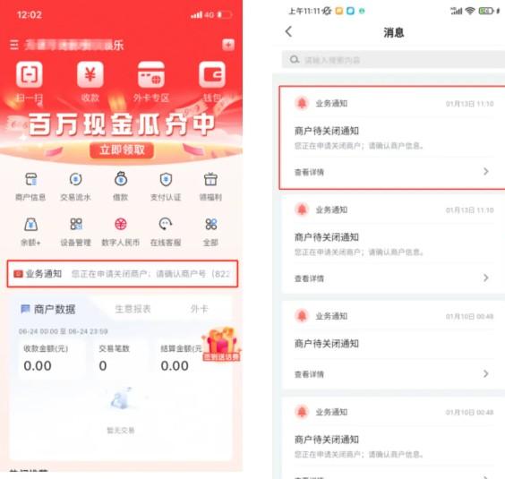 客服確認(rèn)您的關(guān)閉需求后,請回到拉卡拉APP首頁,選擇老板身份,點擊首頁金剛區(qū)下方的業(yè)務(wù)通知欄(或右上角+內(nèi)的消息)。