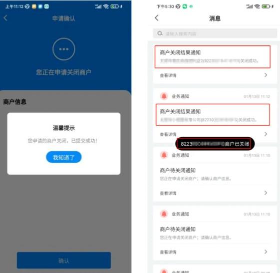 確認(rèn)無誤后點擊下方的確認(rèn)按鈕提交,消息通知頁面可查詢商戶關(guān)閉結(jié)果,如已操作成功,會顯示商戶關(guān)閉成功。