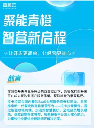 拉卡拉聯(lián)合國內(nèi)餐飲SaaS頭部服務(wù)商天財(cái)商龍,共同推出新一代餐飲數(shù)智化運(yùn)營平臺(tái)一-拉卡拉青橙云,通過智能收銀終端、沉浸式智慧餐廳、全域會(huì)員增長賦能、供應(yīng)鏈數(shù)智化管控、智能報(bào)表平臺(tái)五大核心能力,為餐飲企業(yè)提供全鏈路閉環(huán)解決方案。