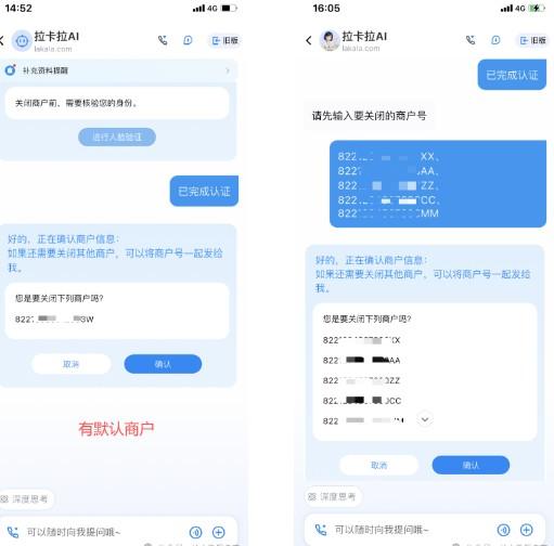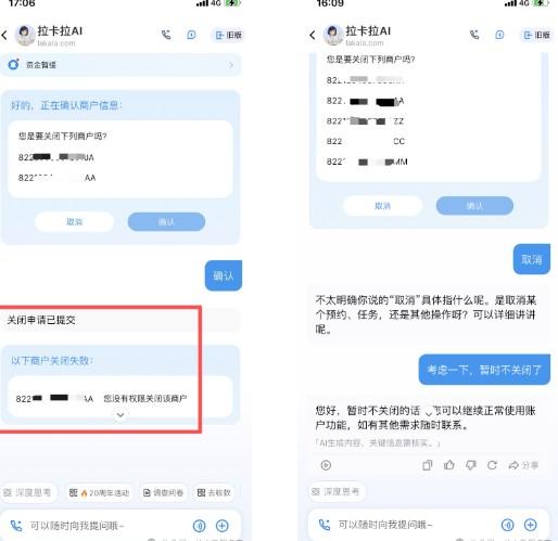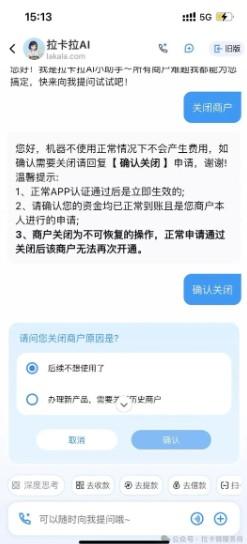 在拉卡拉AI對(duì)話框內(nèi),輸入【關(guān)閉商戶】,閱讀提示后輸入【確認(rèn)關(guān)閉】。